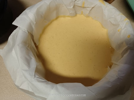 4. Pour the cake batter into the pan. The batter is supposed to be runny. Use a skewer or chopstick to pop any bubbles. Bang the pan on the counter 3-4 times to pop any large bubbles