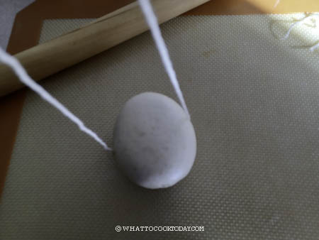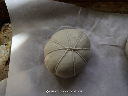 - Cut 9 pieces of about 50 cm long kitchen twine. Toss them in a bit of oil so they won’t get stuck to the bread during baking. Place 1 piece of string on your work surface. Place the dough ball on the string and crisscross it over the dough and then bring the string down, crisscrossing at the bottom and then up again. Try not to do it too tight to allow some room for expansion during fermentation and baking. So you get 8 sections. Tie the string into a knot and cut off the excess string with a scissor. Repeat with the rest of the strings and dough