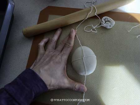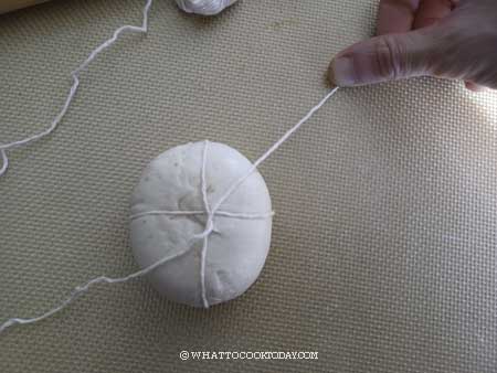 - Cut 9 pieces of about 50 cm long kitchen twine. Toss them in a bit of oil so they won't get stuck to the bread during baking. Place 1 piece of string on your work surface. Place the dough ball on the string and crisscross it over the dough and then bring the string down, crisscrossing at the bottom and then up again. Try not to do it too tight to allow some room for expansion during fermentation and baking. So you get 8 sections. Tie the string into a knot and cut off the excess string with a scissor. Repeat with the rest of the strings and dough