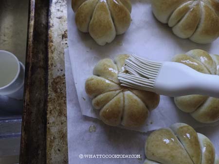 - Transfer the buns to a cooling rack. Brush with some melted coconut oil if you like for an extra soft crust. Let the buns cool down on the cooling rack for 10-15 minutes. Carefully cut off the knots and remove the strings gently. Take one pistachio and gently push it into the center of the buns to create stems. They can be served warmed or at room temperature