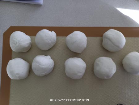 - Punch the dough down and give it a knead for a few times. Divide into 9 equal -size smaller doughs. Round up each dough to roughly form a ball. Cover and let them rest for 15 minutes
