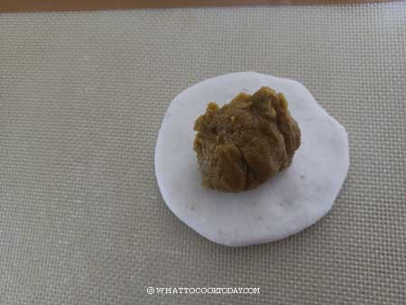 - Then work with one dough at a time, flatten the dough with your palm and roll it into a round shape, about 4 inches in diameter. Scoop about 1- 1 1/2 tablespoons of pumpkin kaya and put in the middle of the dough. Gather the dough around the edge to seal. Pinch the seam to seal really well so it won’t open up after proofing. Place on a baking sheet lined with parchment paper, about 2 inches apart. Repeat with the rest of the dough and filling