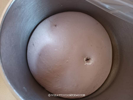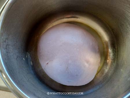 4. Transfer the dough to a lightly oiled bowl and cover with a cling wrap. Let it ferment until it doubles in size. When you poke your finger into the dough, the indentation stays. This indicates a properly proof dough. This may take one to two hours depending on the temperature