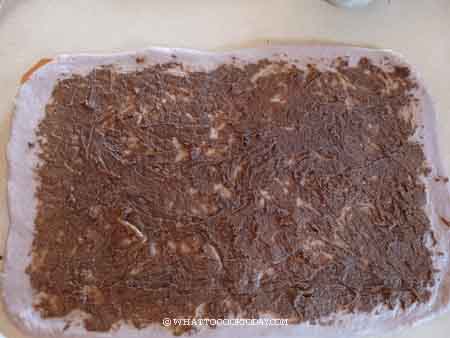 - Transfer the proofed dough to a work surface. Give it a knead a few times to degas the dough and then roll the dough out into a rectangle about 10 x 12 inches. Spread the filling on the dough surface, leaving about 1 inch space from the edge of one of the long sides