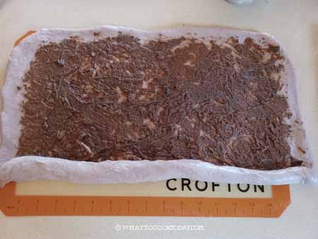 6. Grease a 9 x 9 inch pan with some butter. You can also line the pan with parchment paper like I did. Transfer the proofed dough to a work surface. Give it a knead a few times to degas the dough and then roll the dough out into a rectangle about 10 x 12 inches. Spread the filling on the dough surface, leaving about 1 inch space from the edge of one of the long sides