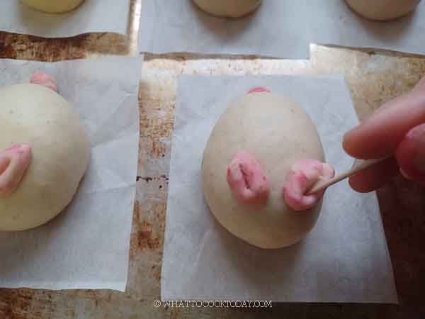 6. For ears, tails, and eyes: I pinch off a tiny amount of dough from the 80-gram dough for the eyes, you don’t need much. I use a small amount of charcoal to color the eyes black. You can use cocoa powder too if you don’t have black. The rest I color it pink to make the ears and tails. You will need 20 ears, 10 tails, and 20 eyes