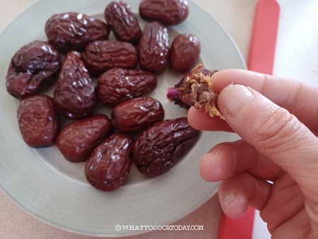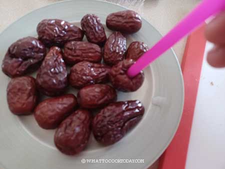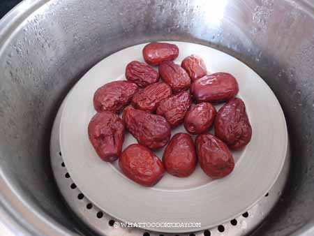 - Rinse the red dates clean with water. Put them in a heat-proof plate and steam over medium heat for 20 minutes