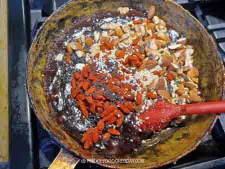 10. Add the toasted walnuts or any nuts you use, goji berries, and black sesame seeds into the paste and stir to combine everything evenly. All the dry ingredients need to be coated by the paste. Remove from the heat