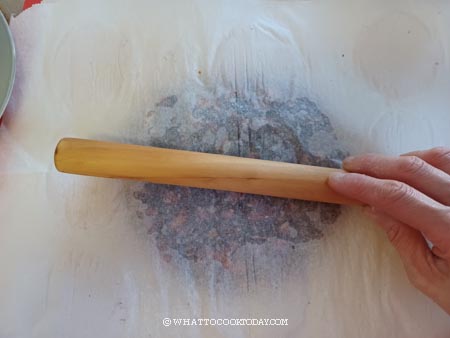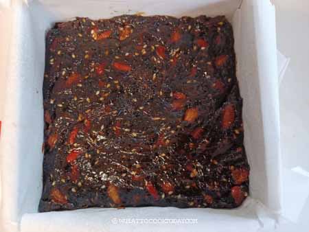11. Transfer the mixture to a prepared pan. It’s an extremely sticky mixture at this point. Cover the top with parchment paper and then use your palm to apply pressure to pack down the mixture. Use a rolling pin to roll or any flat-bottom pan to press on the surface to pack it down. The paste should fill up the pan corner to corner if you use a pan