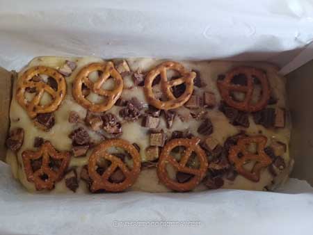 5. Press this dough on the pan evenly. Put the rest of the chopped Reese’s cups reserved for topping. Gently press on the dough. Press the pretzel pieces on top of the dough