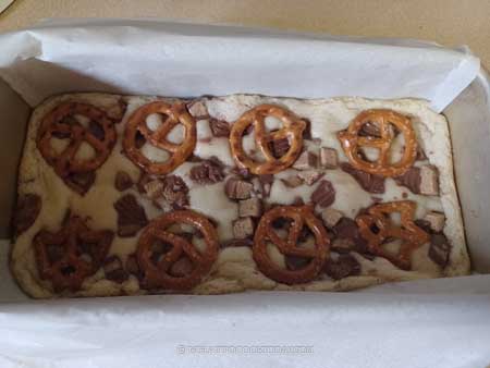 - Press this dough on the pan evenly. Put the rest of the chopped Reese's cups reserved for topping. Gently press on the dough. Press the pretzel pieces on top of the dough