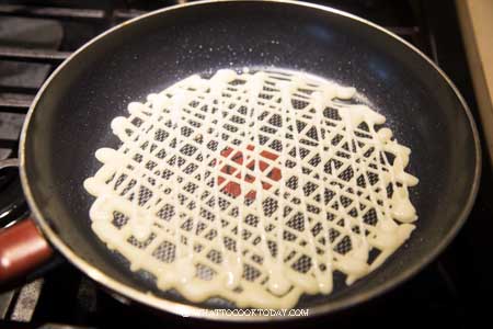 - Gently squeeze the batter onto the pan, starting from the side of the pan, in sort of an up and down motion and then move to the top of the pan and left and right motion to create that net look. Cook for about 2 minutes over low-medium heat. Do not overcook the crepe. It should not be brown or crispy. There's no need to flip over to cook the other side. Use a rubber spatula to remove the net crepe onto a plate. Cover the crepe with aluminum foil to keep them warm while you cook the rest of the crepes
