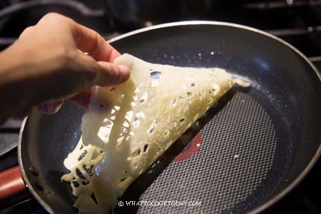 Cook for about 2 minutes over low-medium heat. Do not overcook the crepe. It should not be brown or crispy. There’s no need to flip over to cook the other side.