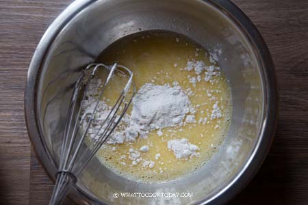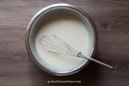 - Combine the coconut milk and water and stir to mix. Place the flour, turmeric powder, and salt in a medium bowl and stir to mix. In another mixing bowl, whisk the eggs, add 1/3 of coconut milk and water mixture and whisk, then add 1/3 of the flour mixture. Continue to alternate and whisk until you run out of the coconut milk and flour mixture. Strain the batter to another large mixing bowl or measuring cups with a pouring spout will help to make the job easier later. Let the batter rest for 20 minutes. You can skip the resting if you use gluten-free all-purpose flour.