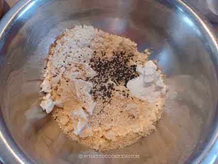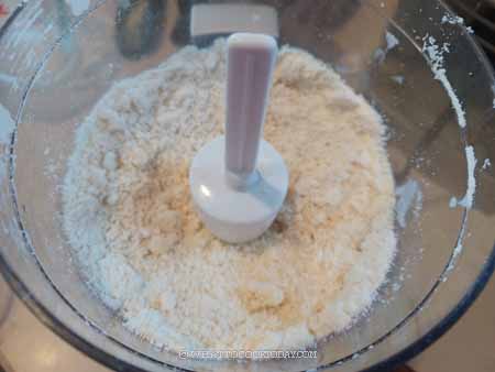 - Put cold butter, all-purpose flour, almond flour, garlic powder, black pepper, sugar, and salt in a food processor and pulse a few times to get pea-size crumbs