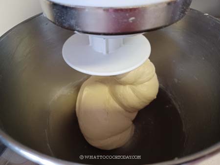 3. Add the softened butter in 3-4 additions, pat by pat. Add butter only after the dough has roughly absorbed the butter, in about 2-3 minute intervals. Let it continue to knead until the dough is smooth, shiny, and elastic, still slightly sticky. You may have a bit of dough still sticking to the side of the bowl, that’s ok. This may take an additional 7-10 minutes (or longer) of kneading.