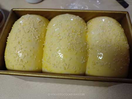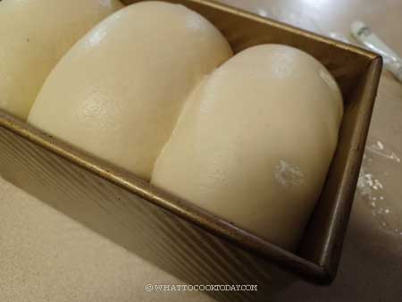 10. Cover the loaf pan with a plastic wrap and let it ferment until they reach the top of the pan, about 1 hour at a warm place. 15 minutes before the end of the proofing, preheat oven to 350 F (180 C) for convection oven, 330 F (165 C) for convection oven