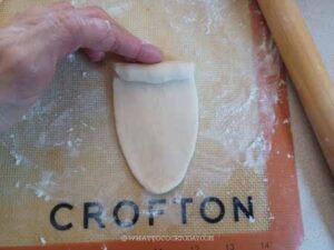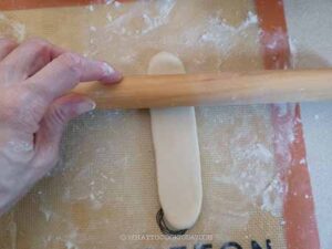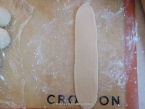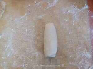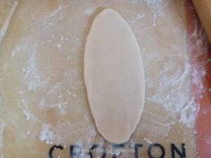 - Roll the dough from the center and outward into an oblong shape, about 5 inches long.