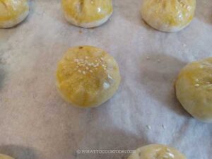 Siew Bao (or Shao Bao) literally means “baked bun.” Unlike regular steamed pork buns (char siu bao), siew bao is wrapped in a water-oil pastry and baked until golden brown. The filling is usually chopped char siu (Chinese BBQ pork) tossed in a sweet and savory sauce. The pastry has a slightly crisp outer shell and tender, layered texture inside—kind of like a cross between a shortcrust and puff pastry.