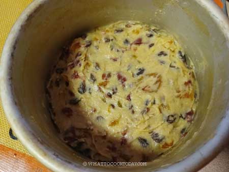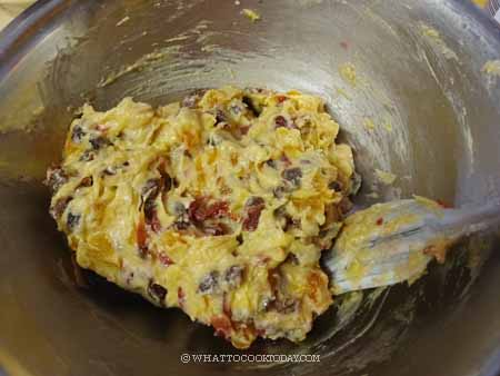 - Add half of the eggs and mix until combined and then add the rest of the eggs and then mix until combined. Add milk and stir to combine. Sift in the dry ingredients and mix until you don't see any more pockets of flour. Fold in the dried fruit and cherries