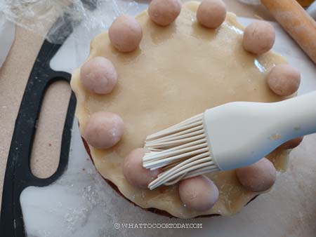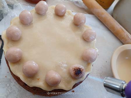 - Brush the top of the cake (which is covered by marzipan) with egg white. Attach the 11 marzipan balls on the perimeter of the cake. Brush the marzipan balls with some egg whites. If you have a hand blow-torch, you can blow-torch the apostle balls and the surface of the marzipan slightly to give it a bit of golden-ish burnt look