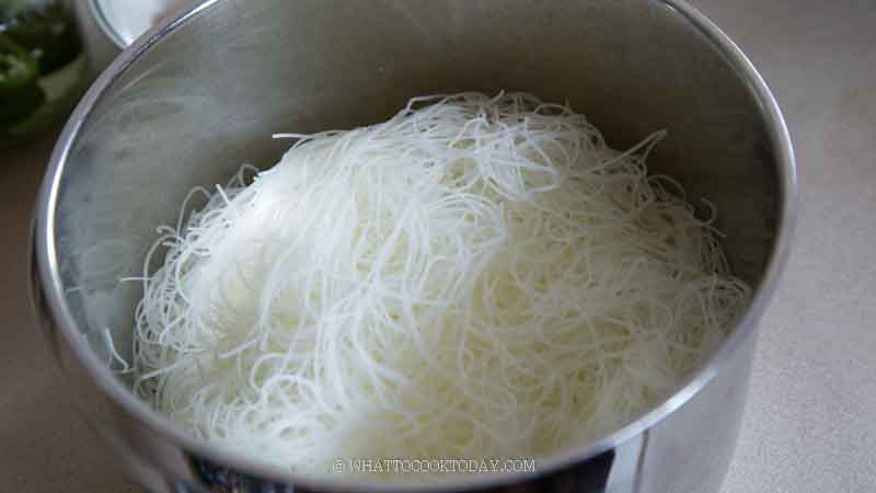 - Soak the rice vermicelli noodles in water until softened. It took about 10 minutes. The time depends on the bee hoon you use. Drain off water and set the soaked bee hoon aside while you prepare other things