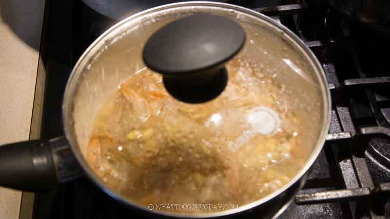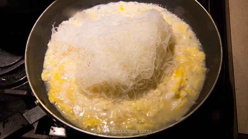 9. Then add the bee hoon and seasonings and cover. Let it cook until the bee hoon just started to get soften. I used thin bee hoon so I don’t want to overcook it, about 1 minute.