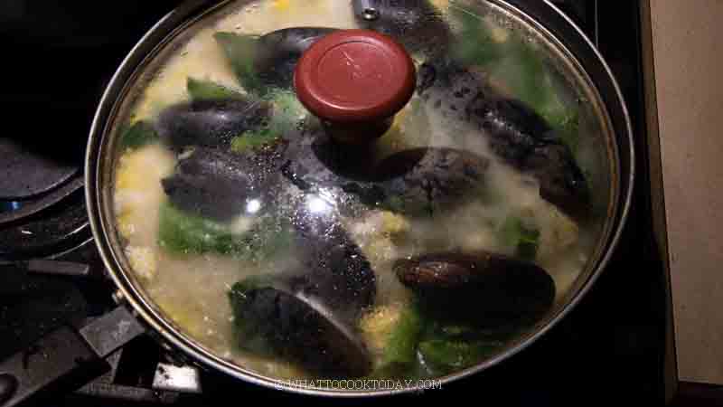 12. Let them cook until the mussels open up. Discard the ones that remain closed. Stir to combine. Have a taste and adjust seasoning as needed. Garnish with some stalks of green parts of green onion