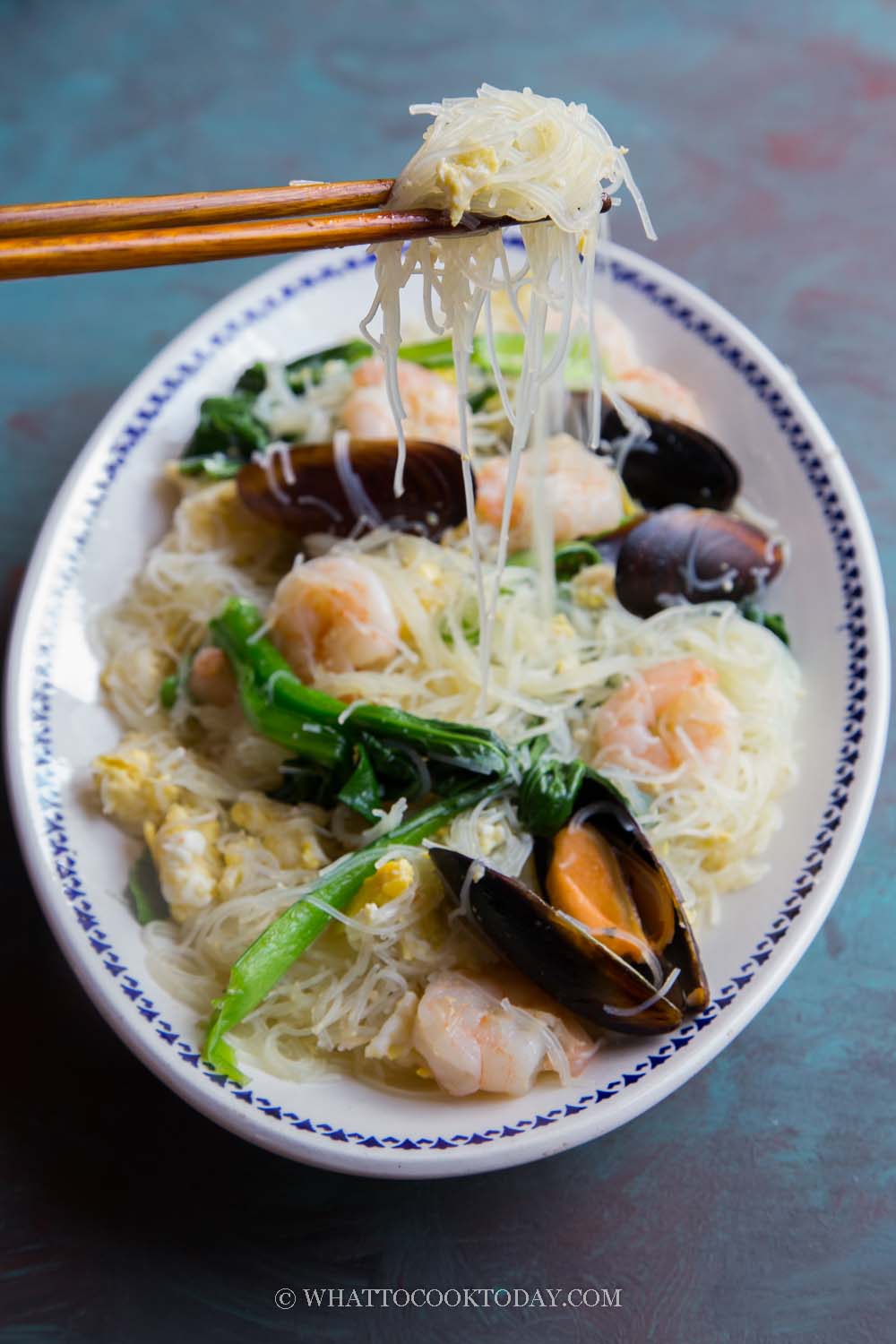 - Add the rest of the oil. Saute garlic for about 30 seconds, push it aside and then add eggs and let them cook undisturbed for about 30 seconds and then start scramble them until about 80 % cooked, so they are still a bit wet. Pour the stock and bring it to a boil. Then add the bee hoon and seasonings and cover. Let it cook until the bee hoon just started to get soften. I used thin bee hoon so I don't want to over cook it, about 1 minute. Uncover and then I add the yu choy and cover and let it cook for another minute. Then add the mussels and cover. Let them cook until the mussels open up. Discard the ones that remain closed. Add the shrimp back. Stir to combine. Have a taste and adjust seasoning as needed. Garnish with some stalks of green parts of green onion.