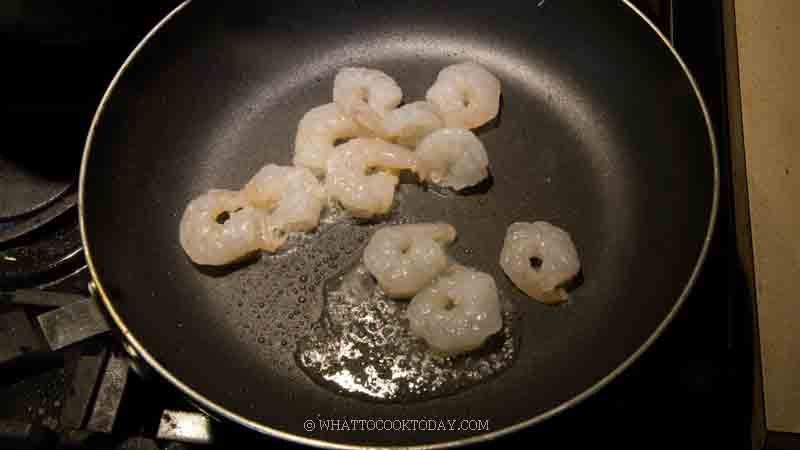 - Pat the shrimp pieces dry. Add sesame oil, salt, sugar, ground white pepper and marinate while you prepare other things