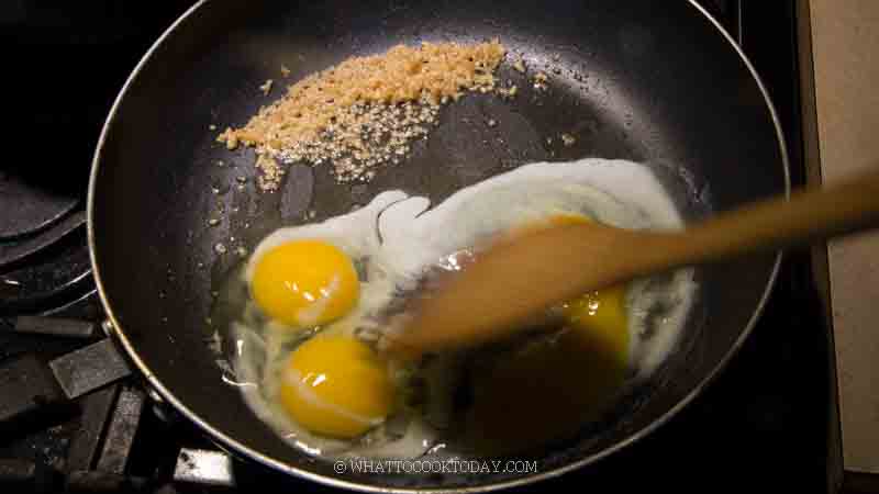 6. Push it aside and then add eggs and let them cook undisturbed for about 30 seconds