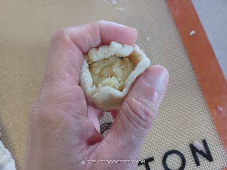 - Work with one dough at a time. Use your thumb to make an indentation in the middle and then put one filling in and mold the dough around the filling to enclose it. Pinch the seam to seal it. Round it into a dough ball