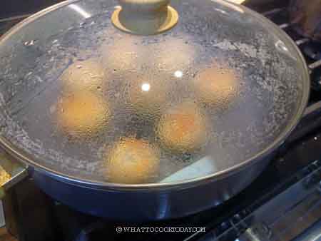 12. To cook on the stove: Arrange the cake on the pre-heated pan without any oil. You may need to cook in batches. Cover with a lid and cook for about 5 minutes or until the bottom side is golden brown and then flip over, add few drops of water on the pan to create some steam, cover with a lid again and cook for another 5 minutes or until they are golden brown