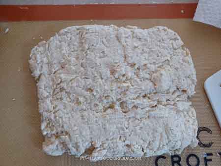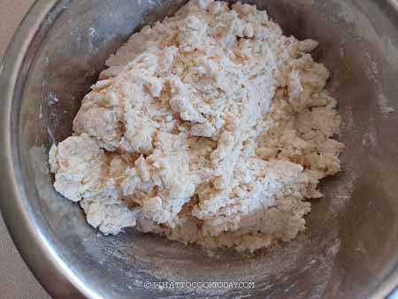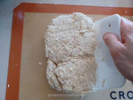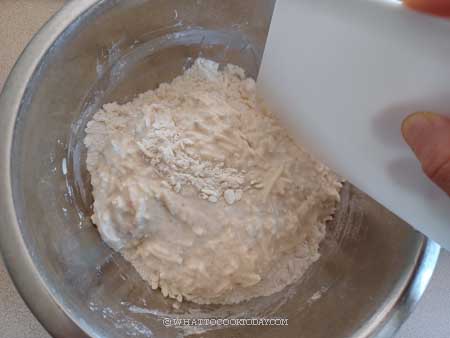 6. Use a dough scraper to cut and fold the wet and dry. DON’T knead the dough. It will be dry and shaggy and there maybe still some loose flour. Do not overmix. We try to handle the dough as little as possible.