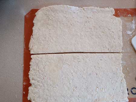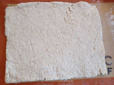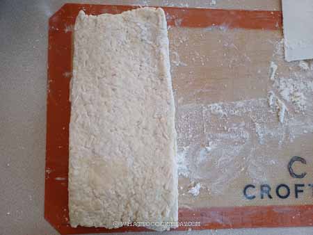 12. Rotate the dough a quarter turn. Roll it out again into about 10 inches long. Cut in half again crosswise and then stack the top half on top of the bottom half. Rotate a quarter turn again and repeat the rolling, cutting, and stacking one more time. So a total of three sets.