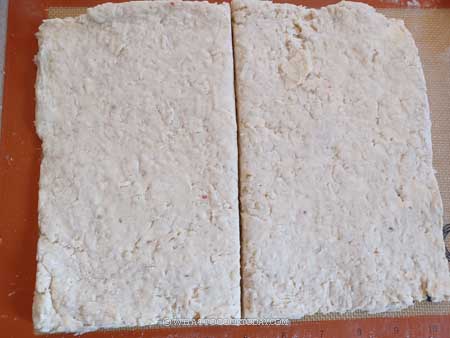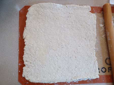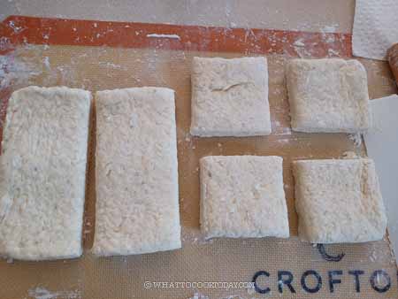 13. Then roll the dough out to about 1-inch thickness. I use a serrated knife to cut using a “sawing” motion. Do not cut the dough by pressing the knife down as you seal the edges and the biscuits won’t rise. If you use a biscuit cutter, use the 2.5 inch round cutter. Push straight down and lift the cutter up. DO NOT twist the cutter. When you do that, you seal up the edges and it won’t rise when you bake it. Cut as close as possible to minimize dough scrape