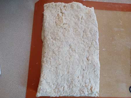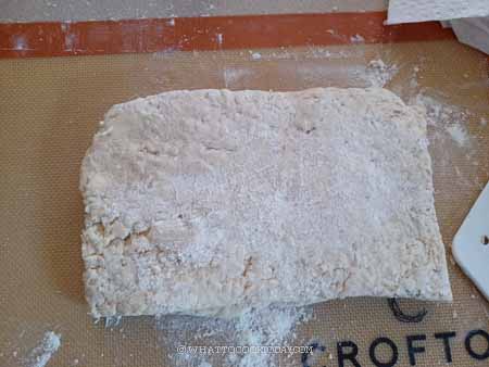 - Transfer the dough along with loose bits of flour into a countertop. Limit touching the dough with your hands to avoid warming up the butter too much. Use a bench scraper to collect the dough and the dry bits of flour together and press it down to form a rough rectangle that is about 1 inch thick.