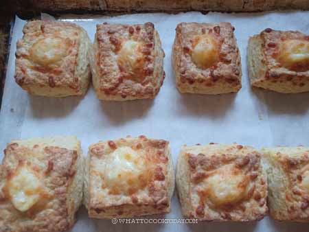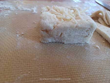 15. Use your thumb to make an indentation in the middle of the biscuits. Why? This is to prevent the biscuits from tipping over to the side when they bake, which happens more often than not. Sprinkle the rest of the cheese you set aside earlier on top of the indentation. You don’t have to make indentations on the dough balls you made from the scrape