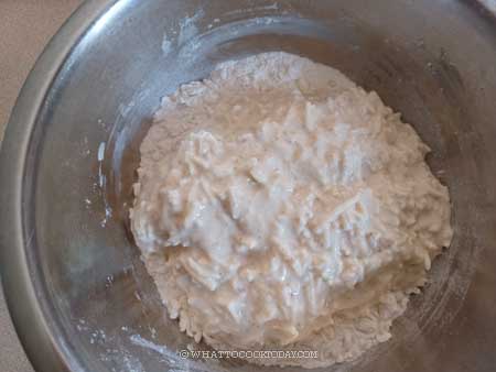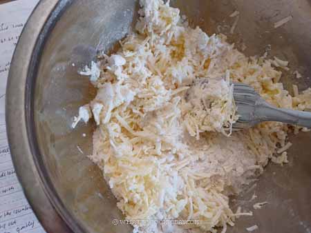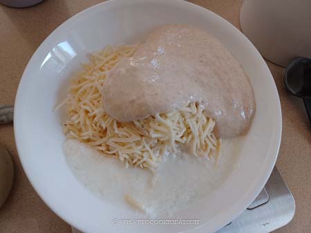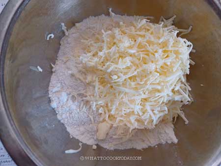 3. Set aside 30 g (1/8 cup) of the cheese for topping. Measure out the starter and start with 60 g (1/4 cup) of buttermilk. If your starter is runny, that maybe all the buttermilk you need. Add the rest of the cheese. Whisk to combine. My starter is thick and so I use a total of 80 g (1/3 cup) of buttermilk. Mix until you get a thick batter-like consistency. Keep this in the fridge for 20 minutes to keep it cold
