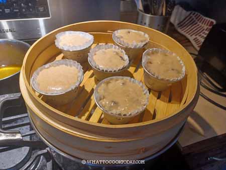 - Place the cups inside the steamer and steam over high heat. Make sure the heat is high. Steam for 15 minutes. Do not open the lid throughout the steaming process. After 15 minutes, you can open the lid immediately and remove the cake from the steamer. Let them cool down for 1 minute and then transfer out from the muffin tin and let them cool down on a cooling rack