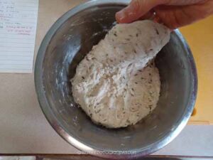 - Stretch and fold # 1: Wet your fingers lightly. Pick up the dough from one of the edge, kinda wiggle it and stretch it up and fold it over.