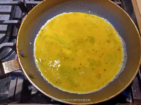 5. Add 1 tablespoon of butter to the same pan again and heat up over medium heat until it melts. Add the eggs and let them cook undisturbed for about 30 seconds until the eggs look slightly set on the edge but still runny in the middle.
