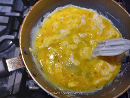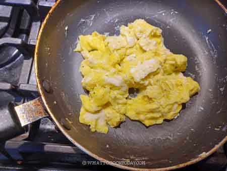 6. Use a spatula to gently push the eggs from the edge towards the middle and let them cook for another 10-15 seconds. The eggs should start to set softly and still have some runny part. Remove the pan from the heat and give it a few more pushes and leave it in a pan to finish cooking