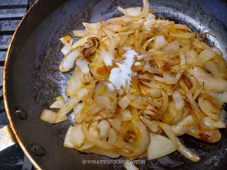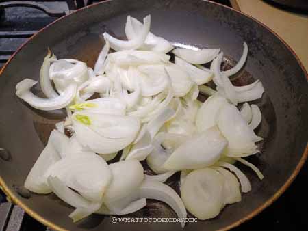 - Preheat a large pan with 1 tablespoon of oil over medium heat. Add the onion slices and sweat for about 3 minutes. Then add soy sauce and sugar and continue cooking until sugar dissolves. Remove from the pan into a plate