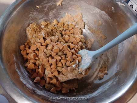 - Add the dry ingredients and combine into a soft dough. Reserve about a quarter of the butterscotch and a quarter of the granola pieces to press on top of cookies later. Fold in the rest of butterscotch chips and granola. Wrap in a cling wrap and pat into a disc and chill in the fridge for 1 hour or in the freezer for 30 minutes