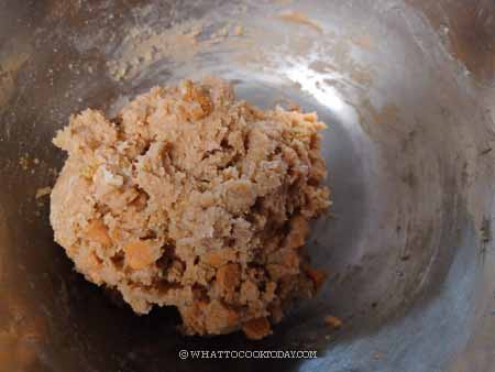 2. Add the dry ingredients and combine into a soft dough. Reserve about a quarter of the butterscotch and a quarter of the granola pieces to press on top of cookies later. Fold in the rest of butterscotch chips and granola.