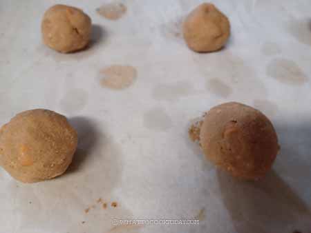 - Portion the cookie dough into 22 pieces, which is about 35 grams each (about 1 1/2 Tbsp). Roll into a round dough ball. Place them on a prepared baking sheet, about 2 inches apart.