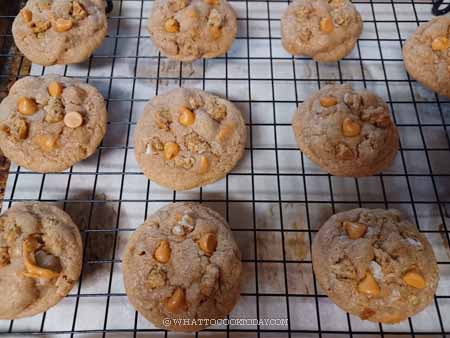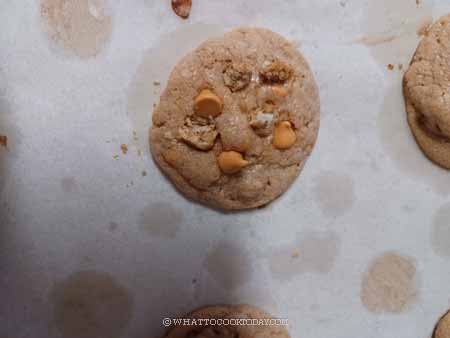 5. 10 minutes before you plan to bake, preheat the oven to 350 F (180 C) for conventional oven, 330 F (165 C) for convection oven. I recommend baking one tray at a time. Position the oven rack in the middle. Place the baking sheet in the oven and bake for 10-11 minutes. Do not overbake these cookies. They appear very soft when they just come out from the oven. Immediately press on about 3 butterscotch chips and some granola bits on top of the cookies and let them cool down completely on the pan