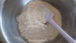 - Add the flour mixture and put on the lowest speed and beat until just combined.