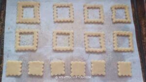- Line 2 baking pan with parchment paper. Roll the dough out in between two pieces of parchment paper instead of a lightly flour your work surface. If you keep adding flour, the cookies will turn dry and tough. So, if you choose to roll on a work surface, try not to use too much flour.